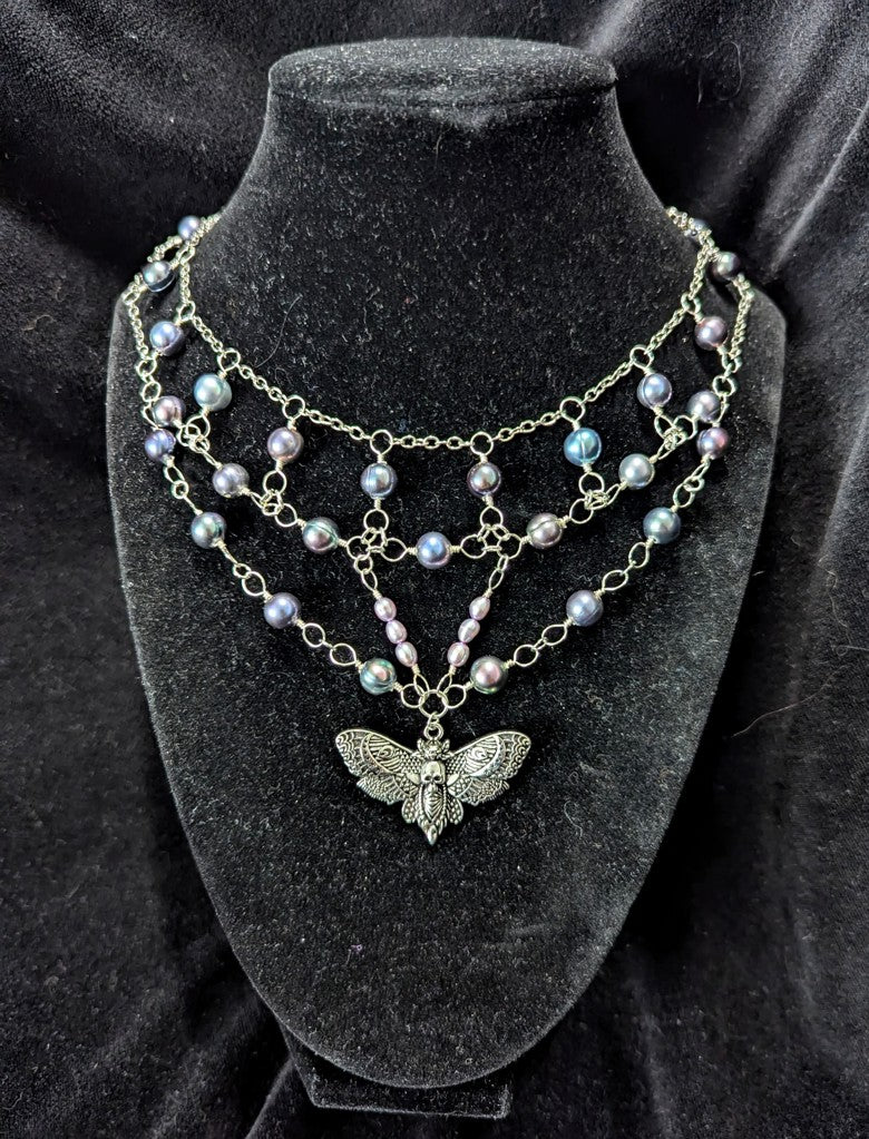 In the Artist's own words, "Atropos may be the prettiest necklace I've ever made! 35 iridescent freshwater pearls support a silvery death's head moth pendant. Each pearl shines with its own dusky luster, no two the same.